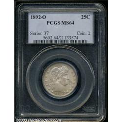 <TABLE cellSpacing=0 cellPadding=0 width="100%" bgColor=#000000 border=0><TBODY><TR><TD width="100%"><TABLE cellSpacing=1 cellPadding=3 width="100%" border=0><TBODY><TR><TD width="100%" bgColor=#79735c><FONT face=arial color=#ffffff size=3><B>Description</B> </FONT></TD></TR><TR><TD width="100%" bgColor=#ffffff><FONT face=arial size=2><B>1892-O 25C MS64 PCGS.</B></I> Type One Reverse. Tan-rose patina lays atop the surfaces of this truly near-Gem piece. One mark, a reeding mark on the bottom of Liberty's neck, literally keeps this piece out of a Gem holder. Still, a high end piece. </FONT></TD></TR></TBODY></TABLE></TD></TR></TBODY></TABLE><BR><A name=PricesRealized></A><TABLE cellSpacing=0 cellPadding=0 width="100%" bgColor=#000000 border=0><TBODY><TR><TD width="100%"><TABLE cellSpacing=1 cellPadding=3 width="100%" border=0><TBODY><TR><TD width="100%" bgColor=#79735c><A name=PR><FONT face=arial color=#ffffff size=3><B>Previous Prices from Heritage Auctions</B> </FONT></A></TD></TR><TR><TD bgColor=#f6f6ed><TABLE cellSpacing=0 cellPadding=0 width="100%" border=1><TBODY><TR><TD align=middle width="33%"><B>Date</B></TD><TD align=middle width="33%"><B>Service</B></TD><TD align=middle width="33%"><B>Price</B></TD></TR><TR bgColor=whitesmoke><TD width="33%"><B>08/07/1999</B></TD><TD width="33%">PCGS</TD><TD width="33%">$546.25</TD></TR><TR bgColor=whitesmoke><TD width="33%"><B>06/04/1993</B></TD><TD width="33%">PCGS</TD><TD width="33%">$715.00</TD></TR><TR bgColor=whitesmoke><TD width="33%"><B>01/06/1993</B></TD><TD width="33%">NGC</TD><TD width="33%">$484.00</TD></TR><TR bgColor=whitesmoke><TD width="33%"><B>06/24/2003</B></TD><TD width="33%">NGC</TD><TD width="33%">$471.50</TD></TR><TR bgColor=whitesmoke><TD width="33%"><B>08/06/2003</B></TD><TD width="33%">PCGS</TD><TD width="33%">$483.00</TD></TR></TBODY></TABLE></TD></TR><TR><TD bgColor=#ffffff><FONT face=arial size=1 ?>PLEASE NOTE: All prices realized reflect the final hammer price PLUS the buyer's premium in auctions that charge a buyer's premium. Each item has a notation at the top of the listing indicating whether that lot included a buyer's premium. Example: A item that sells with a final hammer price of $100 and a 20% buyer's premium will display with a price realized of $120. All information listed is intended to be as accurate as possible, but errors are possible. Please use this guide carefully and inform us of any inaccuracies. </FONT></TD></TR></TBODY></TABLE></TD></TR></TBODY></TABLE><BR><TABLE cellSpacing=0 cellPadding=0 width="100%" bgColor=#000000 border=0><TBODY><TR><TD width="100%"><TABLE cellSpacing=1 cellPadding=3 width="100%" border=0><TBODY><TR><TD width="100%" bgColor=#79735c colSpan=6><FONT face=arial color=#ffffff size=3><B>Price Guide*</B> </FONT></TD></TR><TR bgColor=#f6f6ed><TD align=middle><B>Grade</B> </TD><TD align=middle><B>Coin World<BR>(Trends)</B> </TD><TD align=middle><B>Numismedia<BR>Retail</B> </TD><TD align=middle><B>Numismedia<BR>Wholesale</B> </TD><TD align=middle><B>Coin<BR>Universe</B> </TD><TD align=middle><B>Heritage<BR>Value Index</B> </TD></TR><TR bgColor=#ffffff><TD align=middle>63</TD><TD align=right>$400.00</TD><TD align=right>$440.00</TD><TD align=right>$352.00</TD><TD align=right>$425.00</TD><TD align=right>$285.50</TD></TR><TR style="FONT-WEIGHT: bold" bgColor=#cccfdd><TD align=middle>64</TD><TD align=right>$700.00</TD><TD align=right>$720.00</TD><TD align=right>$575.00</TD><TD align=right>$715.00</TD><TD align=right>$474.13</TD></TR><TR bgColor=#ffffff><TD align=middle>65</TD><TD align=right>$1,750.00</TD><TD align=right>---</TD><TD align=right>$1,100.00</TD><TD align=right>$1,625.00</TD><TD align=right>$1,170.38</TD></TR><TR bgColor=#ffffff><TD colSpan=6><FONT size=1>*All information listed is intended to be as accurate as possible, but errors are possible. No item may be returned or refused based on this information which is provided as a service to our customers. You should contact each pricing source directly to determine the accuracy of this information. </FONT></TD></TR></TBODY></TABLE></TD></TR></TBODY></TABLE><BR><TABLE cellSpacing=0 cellPadding=0 width="100%" bgColor=#000000 border=0><TBODY><TR><TD width="100%"><TABLE cellSpacing=1 cellPadding=3 width="100%" border=0><TBODY><TR><TD width="100%" bgColor=#79735c><FONT face=arial color=#ffffff size=3><B>Population Guide</B> </FONT></TD></TR><TR bgColor=#ffffff><TD align=middle><!-- Begin Output of Population Grid--><TABLE cellSpacing=0 cellPadding=0 width="100%" border=0><TBODY><TR><TD vAlign=center><TABLE cellSpacing=0 width="100%" border=1 cellsadding="3"><TBODY><TR><TD vAlign=center><TABLE cellSpacing=0 cellPadding=3 width="100%" border=1><TBODY><TR><TD vAlign=center align=middle bgColor=#f0f1e8 colSpan=2 <CENTER><FONT face=Arial size=2><B>PCGS Pop </B></FONT><CENTER></CENTER></TD><TD vAlign=center align=middle bgColor=#f0f1e8 colSpan=2><CENTER><FONT face=Arial size=2><B>NGC Pop</B></CENTER></FONT></TD></TR><TR><TD vAlign=center><FONT face=Arial size=2>(64)</FONT> </TD><TD vAlign=center align=right><FONT face=Arial size=2>48</FONT> </TD><TD vAlign=center><FONT face=Arial size=2>(64)</FONT> </TD><TD vAlign=center align=right><FONT face=Arial size=2>58</FONT> </TD></TR><TR><TD vAlign=center><FONT face=Arial size=2>(>64)</FONT> </TD><TD vAlign=center align=right><FONT face=Arial size=2>28</FONT> </TD><TD vAlign=center><FONT face=Arial size=2>(>64)</FONT> </TD><TD vAlign=center align=right><FONT face=Arial size=2>30</FONT> </TD></TR></TBODY></TABLE></TD></TR></TBODY></TABLE></TD></TR></TBODY></TABLE><!-- End Output of Population Grid--> Important notice: Heritage usually auctions material at the rate of 200-250 lots per hour. On some occasions eBay Live bid software or the Internet may not be able to keep up with the pace of the auction. We recommend placing a realistic absentee bid now as insurance to avoid disappointment. Occasionally the auctioneer may eliminate or reject an eBay Live bid, and the auctioneer may also reopen a lot