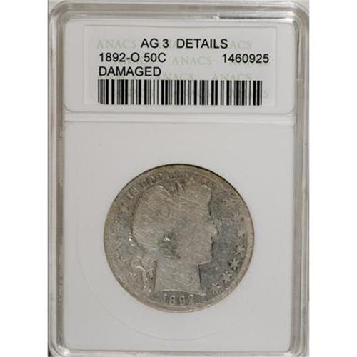 <B>1892-O 50C --Damaged--ANACS AG3 Details.</B></I> NGC Census: (2/209). PCGS Population (8/244). Mintage: 390,000. Numismedia Wsl. Price for NGC/PCGS coin in AG3 : $155. (#6462)<BR><BR><B>Coin Engraver:</B> Charles E. Barber<BR><BR><b>Shipping:</b> Coins & Currency (<a target="_blank" href="http://www.heritageauctions.com/common/shipping.php">view shipping information</a>)