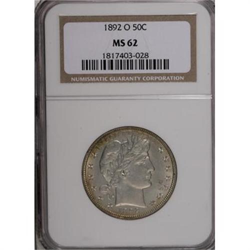 <B>1892-O 50C MS62 NGC.</B></I> A noteworthy Mint State representative of this low-mintage New Orleans issue, well-defined with minimally toned centers and elements of gold-orange toning near the rims. Wispy slide marks on the portrait preclude a finer designation.<BR><BR><B>Coin Engraver:</B> Charles E. Barber<BR><BR><b>Shipping:</b> Coins & Currency (<a target="_blank" href="http://www.heritageauctions.com/common/shipping.php">view shipping information</a>)