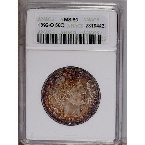 <B>1892-O 50C MS63 ANACS.</B></I> An appealing Select example of this better-date, low mintage Barber half, with deep amber and russet toning that yields to steel-blue and magenta at the rims on both sides. The superior strike and lack of mentionable abrasions seem to indicate a higher grade, one perhaps precluded because the deep toning subdues the luster. Appealing nonetheless, and good value for the assigned grade.