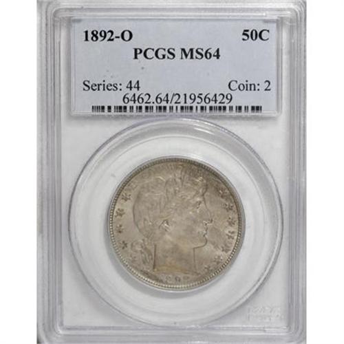 <B>1892-O 50C MS64 PCGS.</B></I> In circulated grades, the 1892-O is considered a key to the series. Its mintage is lower than any other branch mint issue. Perhaps because it was the first year of the type, a few 1892-O halves were set aside in Mint State, but well preserved examples remain very scarce. This satiny chestnut-gray near-Gem has smooth surfaces and a suitable strike. Population: 32 in 64, 16 finer (2/08).<BR><I>From The Chippewa Valley Collection.</B></I><BR><BR><B>Coin Engraver:</B> Charles E. Barber<BR><BR><b>Shipping:</b> Coins & Currency (<a target="_blank" href="http://www.heritageauctions.com/common/shipping.php">view shipping information</a>)