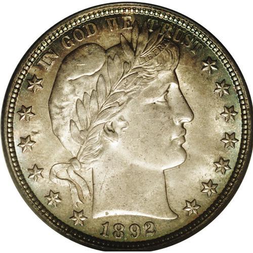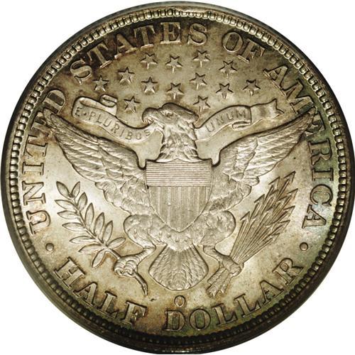 <B>1892-O<50C> MS65 PCGS.</B></I> An extremely popular, first year issue with a low mintage of only 390,000 pieces. This is an unusually well defined piece with only the slightest weakness on some of the eagle's feathers. An abundant amount of argent-gray toning has accumulated overall with sea-green and golden accents at the border areas, this lending a fully original appearance to the coin. A couple of small abrasions are seen on the obverse portrait. Population: 11 in 65, 3 finer (4/06).