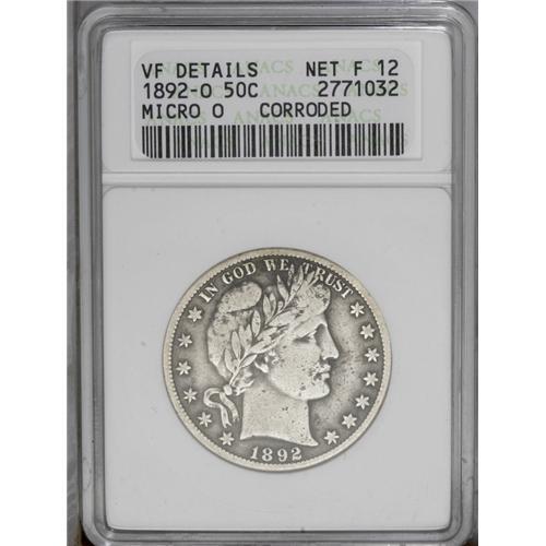 <B>1892-O<50C> Micro O--Corroded--ANACS. VF Details, Net Fine 12.</B></I> The 1892-O is the unchallenged key date to the Barber half series. Its existence was known by 1893, since the variety was discussed by Augustus G. Heaton in his famous 1893 text, <I>Mint Marks: A Treatise on the Coinage of the United States Branch Mints.</B></I> Perhaps its early discovery explains why several Uncirculated examples are known. A few have also survived in Fair to Good grades, but pieces in better circulated grades are extremely rare. The present stone-gray and charcoal example has minute obverse pits, but LIBERTY is nearly complete and E PLURIBUS UNUM is fully visible.