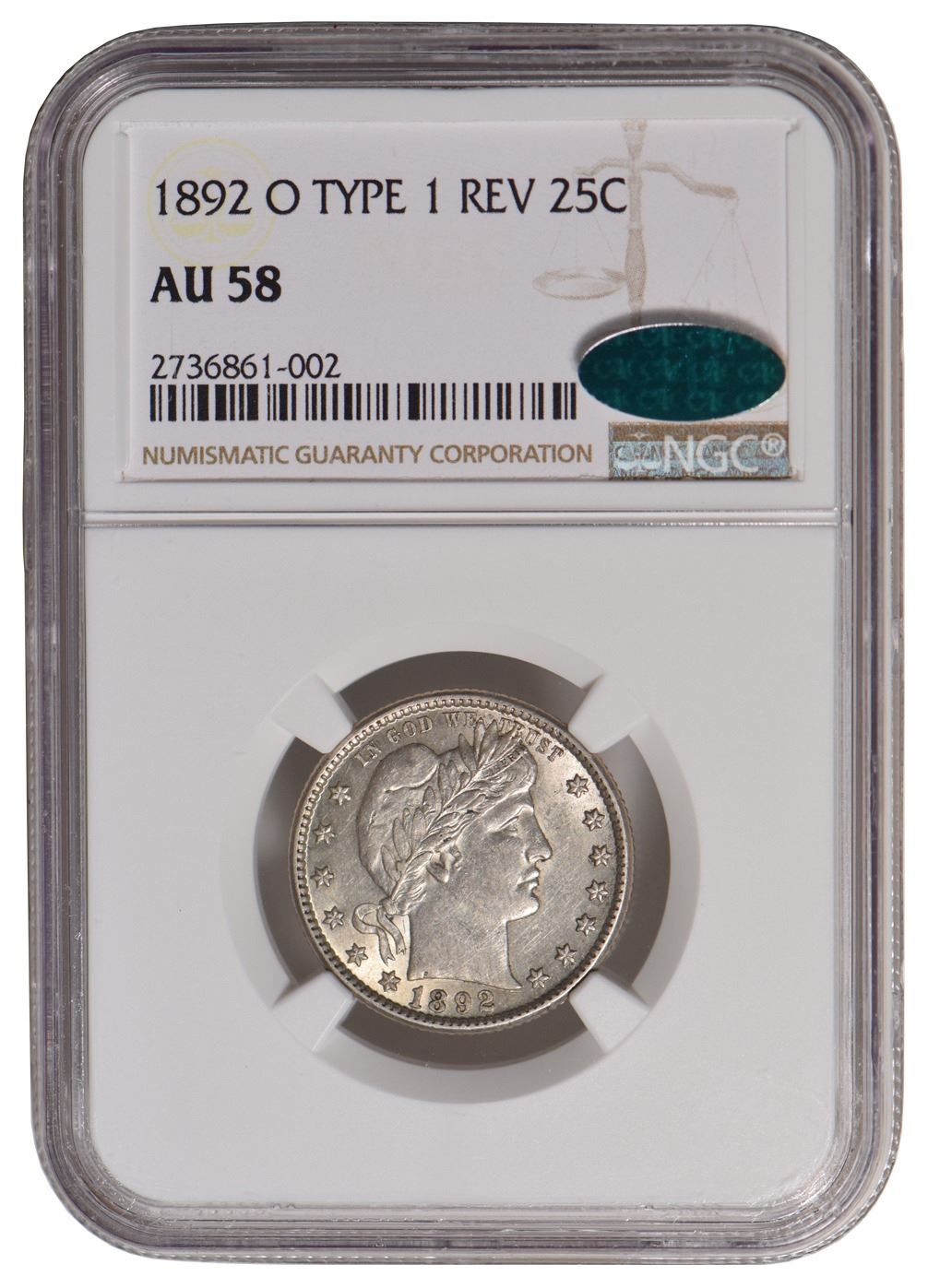 One 1892-O Barber Quarter NGC AU58 CAC.