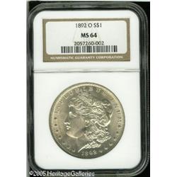 <B>1892-O<img border='0' src='http://www.heritagecoins.com/images/star.gif' width=10 height=10>$1 MS64 NGC.</B></I> Virtually white, lustrous surfaces exhibit just a few minor marks on Liberty's face. Some flatness of strike, which is typical of the issue, is noted in the hair above Liberty's ear and on the eagle's breast. Lot:10394