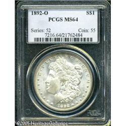 <B>1892-O<img border='0' src='http://www.heritagecoins.com/images/star.gif' width=10 height=10>$1 MS64 PCGS.</B></I> Softly struck above the ear, where faint roller marks (as struck) are visible. Boldly detailed elsewhere, with rich gleaming luster and a few small, scattered blemishes. Touches of golden color are located around the rim areas. Very scarce above this grade level. Lot:10392