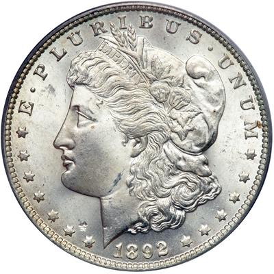 1892-O Morgan Dollar. PCGS graded MS-64. A very choice example. Mostly untoned with ample design in the centers and very sharp detail elsewhere on both sides. This one wears a permanent air of frosty originality (PCGS # 7216).