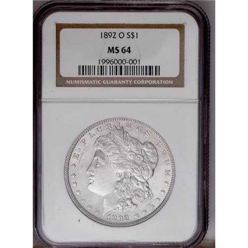 <B>1892-O<img border='0' src='http://www.heritagecoins.com/images/star.gif' width=10 height=10>$1> MS64 NGC.</B></I> Not fully struck in the centers, but the devices are otherwise crisply struck. A lustrous near-Gem that has a nearly pristine obverse and exceptional eye appeal. <BR><BR><B>Important notice:</B> Heritage usually auctions material at the rate of 200-250 lots per hour. On some occasions eBay Live bid software or the Internet may not be able to keep up with the pace of the auction. We recommend placing a realistic absentee bid now as insurance to avoid disappointment. Occasionally the auctioneer may eliminate or reject an eBay Live bid, and the auctioneer may also reopen a lot after the close of the eBay live bidding (usually because we missed an audience bid), and may reject your bid even if it shows you as the winning bidder. By bidding via eBay Live, you agree that Heritage may award the lot to another bidder at its sole discretion under the circumstances described above or any other reasonable circumstances. Since eBay bids are not shown to us until we open the lot on the floor, we treat those bids just like floor bids. In most cases the floor responds before the eBay bid is presented to us, due to Internet lag time, so for consistency we have made it a policy that floor bids are always considered first over tie eBay live bids. Also please note that all Heritage lots purchased through eBay Live carry a 20% Buyer's Premium. Please make sure you read the Terms and Conditions before you bid. This lot is being auctioned in conjunction with a live floor auction by Heritage Galleries & Auctioneers. All final auction and invoice information will be supplied by Heritage Galleries & Auctioneers, and all other information should be considered preliminary. Lot:3600 <BR><BR><B>Winning Notification and Billing:</B> After the FINAL session in this auction is complete, Heritage will send e-mail and snail mail invoices. This process normally takes several days. All final auction and invoice information will be supplied by Heritage Galleries & Auctioneers, and all other information should be considered preliminary. <BR><BR>This auction will be conducted on a live auction floor and over the Internet through eBay Live. If you choose to place an absentee bid, please take a moment to <font color='#0000ff'><u><a href='http://pages.ebay.com/liveauctions/help/before/laabsentee.html'>learn how eBay Live absentee bidding works</a></u></font><font color='#000000'>