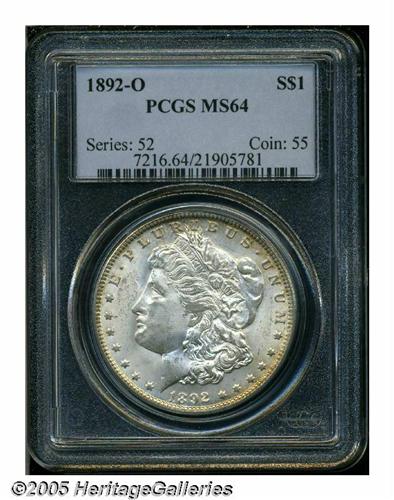 <B>1892-O<S$1> MS64 PCGS.</B></I> Fully brilliant with frosty silver luster and pale gold toning at the borders. This example has typical central weakness common to nearly all survivors of this coinage issue.