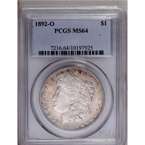 <B>1892-O<img border='0' src='http://www.heritagecoins.com/images/star.gif' width=10 height=10>$1> MS64 PCGS.</B></I> This is an aesthetically pleasing near-Gem with gray-tinged centers and golden-russet peripheral shadings that are more extensive on the reverse. Softly struck in the centers, as often seen on this issue.