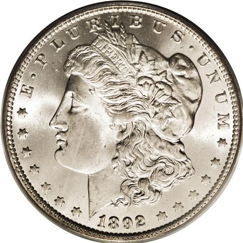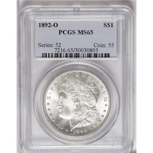 <B>1892-O<img border='0' src='http://www.heritagecoins.com/images/star.gif' width=10 height=10>$1> MS65 PCGS.</B></I> Fully lustrous with frosty silver surfaces and exceptional eye appeal. The 1892-O is a scarce date in all Mint State grades, and a rarity in Gem quality. The quality of strike adds to the overall importance of this Gem. It does not have a full strike, but it is clearly finer than most. Only five finer examples have been certified by PCGS in the non-prooflike category (8/06).