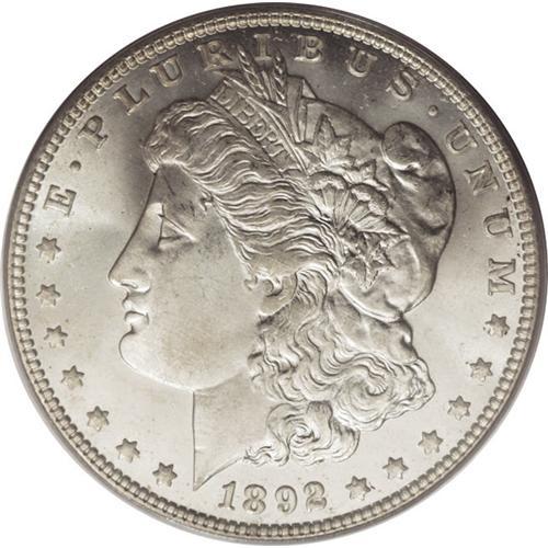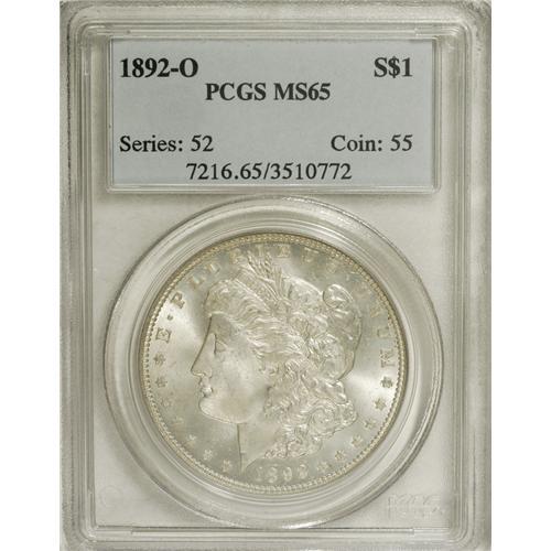 <B>1892-O S$1 MS65 PCGS.</B></I> This popular O-mint issue is seldom seen in Gem condition. The present specimen has a strike that shows some roller marks on the hair above Liberty's ear as well as on the eagle's breast, and a couple of luster grazes on Liberty's cheek that likely account for the grade. The piece nonetheless has considerable appeal, with untoned, frosty surfaces, radiant luster, and moderate contrast on the reverse. PCGS has certified only five coins finer (4/07).<BR><BR><b>Shipping:</b> Coins & Currency (<a target="_blank" href="http://www.heritageauctions.com/common/shipping.php">view shipping information</a>)