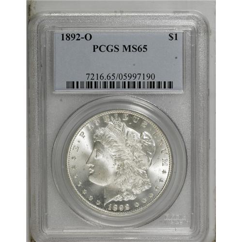 <B>1892-O S$1 MS65 PCGS.</B></I> Virtually completely white, with the slightest traces of gold color on the cheek and hair, and abundant creamy satin luster throughout. The strike, while not full, is well above average for this notoriously softly struck date. Surface abrasions are few and unobtrusive. Light roller marks, as struck, can be seen under magnification on the high points of the obverse. This is an attractive Gem, difficult to find nicer. Population: 119 in 65, 5 finer (10/06).<BR><BR><b>Shipping:</b> Coin/Currency (<a target="_blank" href="http://www.heritageauctions.com/common/shipping.php">view shipping information</a>)