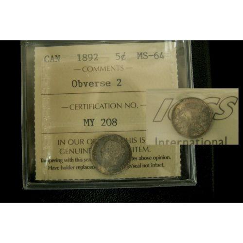 1892 Obv.2 5¢ ICCS MS64, light toning over full lustre.