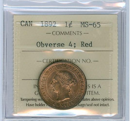 1892 Obv.4 1¢ ICCS MS65 Red. An amazing Victoria Large cent. Excellent strike with clean fields and great surfaces.
