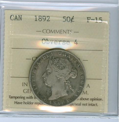 1892 Obv.4 50¢ ICCS F-15, original silver gray tone.