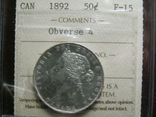 1892 Obv.4 50¢ ICCS F15, mostly brilliant.