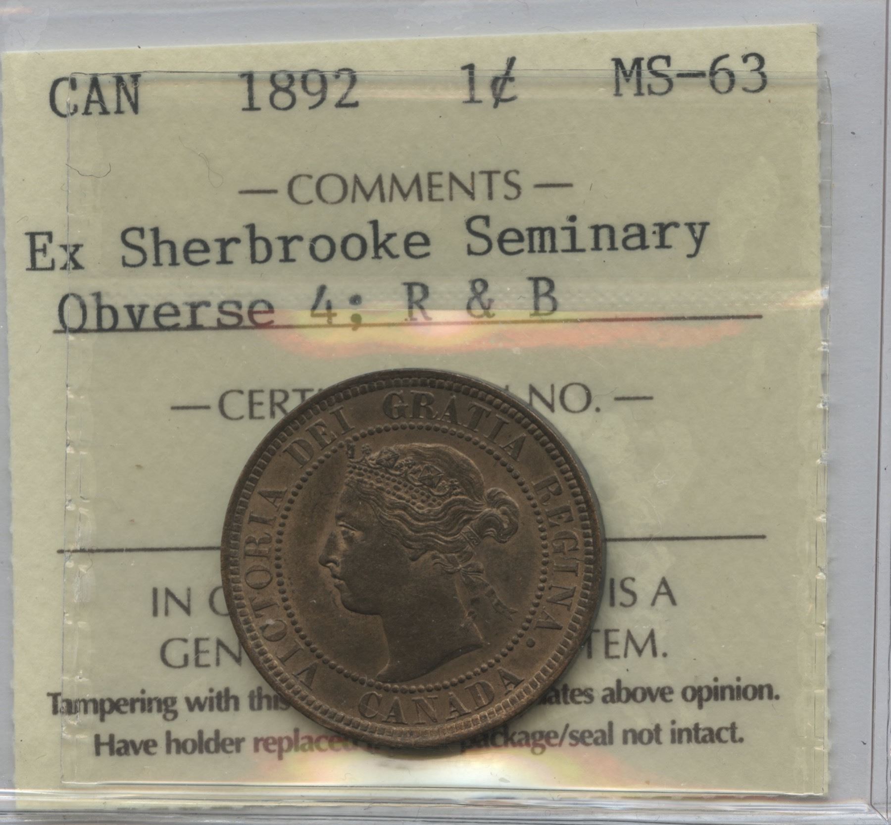 ICCS MS-63. Obverse 4. Red & Brown. Ex: Sherbrooke Seminary.