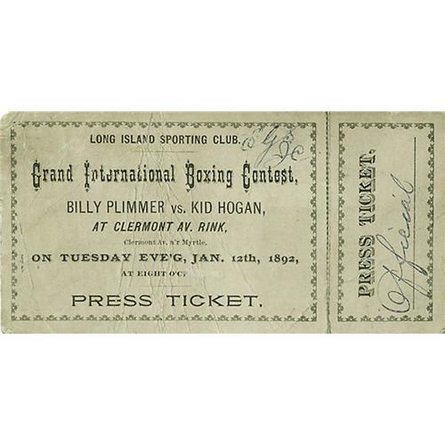<B>1892 Plimmer vs. Hogan Full Ticket.</B></I> On January 12, 1892, at the Long Island Sporting Club, future English bantamweight champion Billy Plimmer fought Kid Hogan. After eight rounds referee Warren Lewis declared the fight a draw. Presented here is a rare, official ticket to this event. The ticket measures 2.75x5.5" and shows some creasing and light soiling. The stub has the word Official written across it and is still attached, but has been reinforced with tape on the back. This is the only known example that we're aware of and may possibly be unique. <BR><BR><B>Important notice:</B> Heritage usually auctions material at the rate of 200-250 lots per hour. On some occasions eBay Live bid software or the Internet may not be able to keep up with the pace of the auction. We recommend placing a realistic absentee bid now as insurance to avoid disappointment. Occasionally the auctioneer may eliminate or reject an eBay Live bid, and the auctioneer may also reopen a lot after the close of the eBay live bidding (usually because we missed an audience bid), and may reject your bid even if it shows you as the winning bidder. By bidding via eBay Live, you agree that Heritage may award the lot to another bidder at its sole discretion under the circumstances described above or any other reasonable circumstances. Since eBay bids are not shown to us until we open the lot on the floor, we treat those bids just like floor bids. In most cases the floor responds before the eBay bid is presented to us, due to Internet lag time, so for consistency we have made it a policy that floor bids are always considered first over tie eBay live bids. Also please note that all Heritage lots purchased through eBay Live carry a 22.5% Buyer's Premium. Please make sure you read the Terms and Conditions before you bid. This lot is being auctioned in conjunction with a live floor auction by Heritage Galleries & Auctioneers. All final auction and invoice information will be supplied by Heritage Galleries & Auctioneers, and all other information should be considered preliminary. Lot:19130 <BR><BR><B>Winning Notification and Billing:</B> After the FINAL session in this auction is complete, Heritage will send e-mail and snail mail invoices. This process normally takes several days. All final auction and invoice information will be supplied by Heritage Galleries & Auctioneers, and all other information should be considered preliminary. <BR><BR>This auction will be conducted on a live auction floor and over the Internet through eBay Live. If you choose to place an absentee bid, please take a moment to <font color='#0000ff'><u><a href='http://pages.ebay.com/liveauctions/help/before/laabsentee.html'>learn how eBay Live absentee bidding works</a></u></font><font color='#000000'>