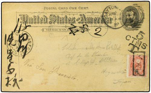1892 Postal stationary card, 1 cent. black (Scott UX10) cancelled by Dayton, Ohio duplex routed via San Francisco addressed to Japan, underpaid with handstruck T CTMS 5, boxed Japanese instructional with Due T.O. manuscript "2" and Japanese koben, 2 sen rose (SG 114) cancelled on arrival by boxed native tax. A rare use of postage due on cover.