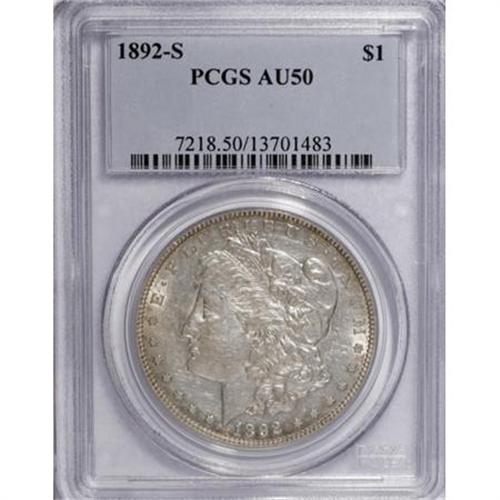 <B>1892-S $1 AU50 PCGS.</B></I> This lightly circulated S-mint coin offers plentiful remaining luster, and the reverse is flashy. Numerous wispy abrasions appear on the silver-gray surfaces, and a lone significant mark is present on the cheek.<BR><BR><B>Coin Engraver:</B> George T. Morgan<BR><BR><b>Shipping:</b> Coins & Currency (<a target="_blank" href="http://www.heritageauctions.com/common/shipping.php">view shipping information</a>)