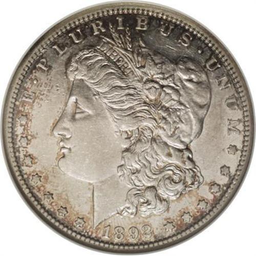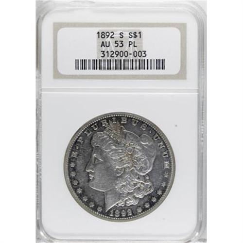 <B>1892-S $1 AU53 Prooflike NGC.</B></I> The mintage of 1.2 million implies the '92-S is scarce but collectible in Mint State. The implication is incorrect, since the '92-S is in fact one of the rarest dates in Uncirculated grades. Prooflikes are extremely rare, and none have been certified as Deep Mirror Prooflike. Although briefly circulated, the present lightly abraded piece has extensive flashy luster, and the orange and ocean-blue toning further confirms the eye appeal. Certified in an older generation holder. Census: 2 in 53 Prooflike, 7 finer (6/07).<BR><I>From the Diamond Head Collection.</B></I><BR><BR><B>Coin Engraver:</B> George T. Morgan<BR><BR><b>Shipping:</b> Coins & Currency (<a target="_blank" href="http://www.heritageauctions.com/common/shipping.php">view shipping information</a>\)