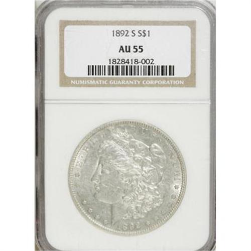 <B>1892-S $1 AU55 NGC.</B></I> Most of the 1892-S dollars were placed into circulation, resulting in it being common in the circulated grades of VF and XF, scarce in AU, and very rare in Mint State. Luster resides in the protected areas of this Choice AU example, with a semiprooflikeness noted on the reverse. The design elements are well defined and the surfaces are quite clean for a coin that has seen limited circulation.<BR><BR><B>Coin Engraver:</B> George T. Morgan<BR><BR><b>Shipping:</b> Coins & Currency (<a target="_blank" href="http://www.heritageauctions.com/common/shipping.php">view shipping information</a>)