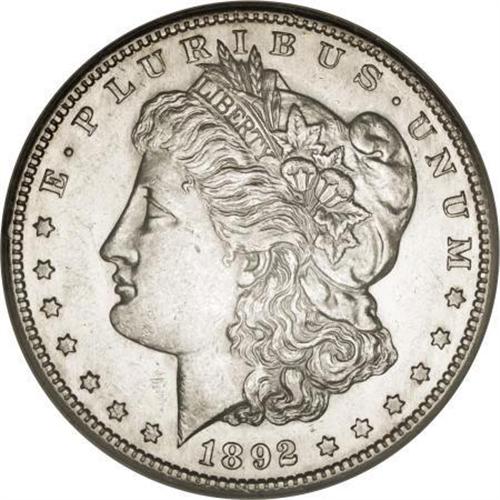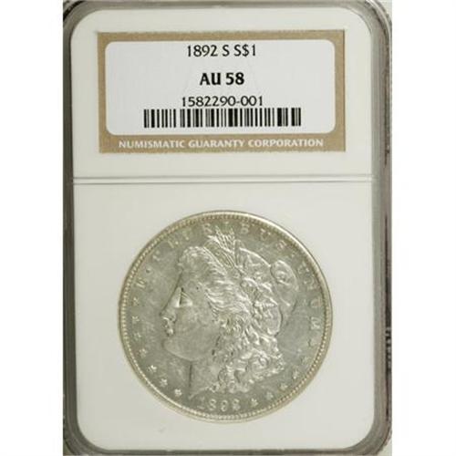 <B>1892-S $1 AU58 NGC.</B></I> A primarily silver-white example of this low-mintage issue, well-defined with just a hint of friction on the uppermost design elements. Scattered, wispy flaws appear in the fields and on the devices, yet the coin retains impressive eye appeal. Each side offers flashy luster; while the obverse shows only diffuse reflectivity, the reverse is fully prooflike. NGC has graded just 47 Mint State coins (3/08).<BR><I>From The Silver Spur Collection of Morgan Dollars.</B></I><BR><BR><B>Coin Engraver:</B> George T. Morgan<BR><BR><b>Shipping:</b> Coins & Currency (<a target="_blank" href="http://www.heritageauctions.com/common/shipping.php">view shipping information</a>)