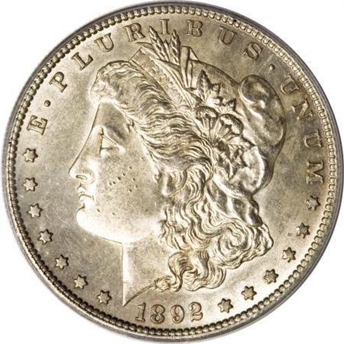 <B>1892-S $1 AU58 PCGS.</B></I> The 1892 and 1893 San Francisco Mint dollars are two of the most important condition rarities in the Morgan dollar series. Although the 1893-S is more highly prized in all grades, the 1892-S is an exceptional rarity in all Mint State grades. For that reason, near-Mint examples such as this piece are always in demand, providing the collector with a coin that will find a comfortable home in an otherwise Mint State collection, at a substantial price savings. For example, <I>Coin World </B></I>"Trends" values the coin at $15,000 in AU58, but $40,000 in MS60.<BR> This example has a faint trace of rub on the eagle's breast, but otherwise shows no signs of wear. A few tiny surface pricks on Liberty's cheek are the only blemishes on either side. It exhibits full brilliance with wispy champagne toning over satiny luster.<BR><I>From The Jimmy G. PCGS Registry Collection of Morgan Dollars with Varieties.</B></I><BR><BR><B>Coin Engraver:</B> George T. Morgan<BR><BR><b>Shipping:</b> Coins & Currency (<a target="_blank" href="http://www.heritageauctions.com/common/shipping.php">view shipping information</a>)