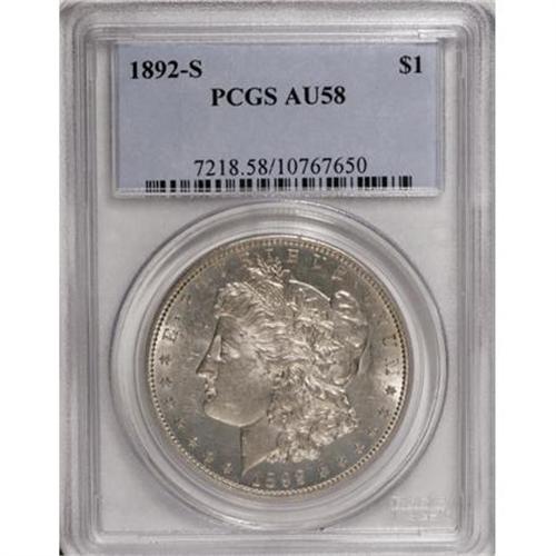 <B>1892-S $1 AU58 PCGS.</B></I> With its production of 1.2 million pieces, the 1892-S is hardly the lowest-mintage Morgan dollar, yet it is one of the most elusive in better grades. The immense difficulty of acquiring a Mint State example puts immense pressure on the tiny supply (estimated at below 100 pieces total), and even near-Mint examples have experienced dramatic increases in demand in recent years.<BR> This attractive survivor, one that doubtless passed as Mint State at least once prior to its encapsulation, offers vibrant and virtually intact luster. The overall definition is excellent, and the highpoints show only a hint of friction. Delicate gold-orange shadings visit the centers, while the margins are minimally toned.<BR><I>From The Oxford Collection.</B></I><BR><BR><B>Coin Engraver:</B> George T. Morgan<BR><BR><b>Shipping:</b> Coins & Currency (<a target="_blank" href="http://www.heritageauctions.com/common/shipping.php">view shipping information</a>)