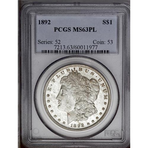 <B>1892<img border='0' src='http://www.heritagecoins.com/images/star.gif' width=10 height=10>$1> MS63 Prooflike PCGS.</B></I> This is a sharply struck and brilliant example with fully prooflike surfaces. A hint of gold color can be seen on both sides, although it is quite faint. A few minor blemishes on Liberty's cheek and elsewhere keep this coin from a higher grade. A scarce date when prooflike.