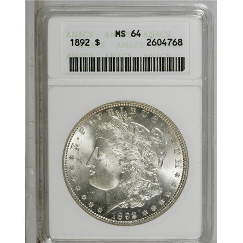 <B>1892 S$1 MS64 ANACS.</B></I> Choice with strong luster. The largely untoned surfaces are generally well struck, though the usual central striking weakness is noted on the obverse. Light marks on each side preclude a higher grade.<BR><BR><b>Shipping:</b> Coin/Currency (<a target="_blank" href="http://www.heritageauctions.com/common/shipping.php">view shipping information</a>)