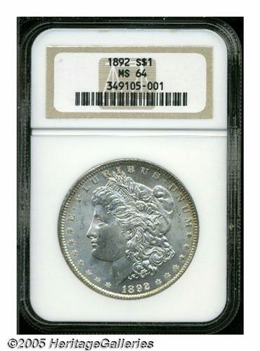 <B>1892<S$1> MS64 NGC.</B></I> Freckles of golden-russet patina are particularly prominent on the reverse periphery. Sharply struck with potent luster and clean surfaces. The upper reverse is lightly die doubled.