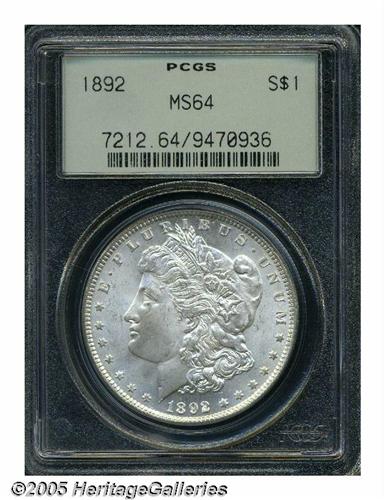 <B>1892<S$1> MS64 PCGS.</B></I> Lustrous and untoned. Some scattered marks are seen, but the overall appearance is fully Choice and the cheek is clean for the grade.<BR><I>From The Milwaukee Shore Collection.</B></I>