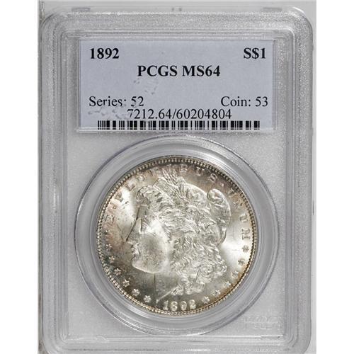 <B>1892<img border='0' src='http://www.heritagecoins.com/images/star.gif' width=10 height=10>$1> MS64 PCGS.</B></I> Showing ample luster and a bold strike with the outer regions revealing hints of russet and cobalt-blue coloration. A few marks on the portrait serve to limit the grade.