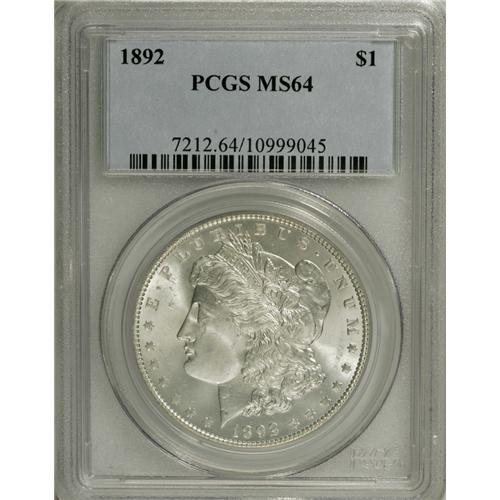 <B>1892 S$1 MS64 PCGS.</B></I> This dazzling and brilliant silver dollar is suitably struck and refreshingly unabraded. A thin mark near the eagle's shoulder is all that denies classification as a full Gem. Among the lower mintage Philadelphia Morgan issues.<BR><BR><b>Shipping:</b> Coins & Currency (<a target="_blank" href="http://www.heritageauctions.com/common/shipping.php">view shipping information</a>)