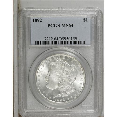 <B>1892 S$1 MS64 PCGS.</B></I> VAM-3. Doubling occurs on the reverse lettering, most notably on IN GOD WE TRUST. Highly lustrous and untoned, a luster graze in the upper left obverse field precludes a higher grade.<BR><BR><b>Shipping:</b> Coins & Currency (<a target="_blank" href="http://www.heritageauctions.com/common/shipping.php">view shipping information</a>)