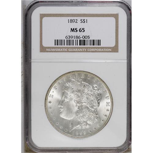 <B>1892 S$1 MS65 NGC.</B></I> VAM-5. If the revived 1921 issues are excluded, mintages of Philadelphia Mint Morgan dollars peaked in 1889. More than 21 million pieces were struck for that date, but production fell annually thereafter, until the 1895 was proof-only aside from the ephemeral 12,000 business strikes. The 1892 is by no means a great rarity, but its mintage of just above 1 million pieces makes it a better date, and it is rare as a Gem. This lustrous and lightly toned piece has clean surfaces and a reasonable strike. Liberty's profile is die doubled.<BR><BR><b>Shipping:</b> Coin/Currency (<a target="_blank" href="http://www.heritageauctions.com/common/shipping.php">view shipping information</a>)