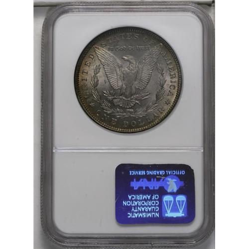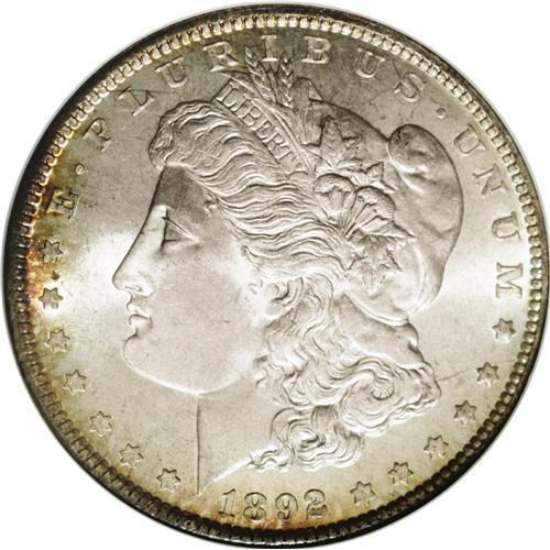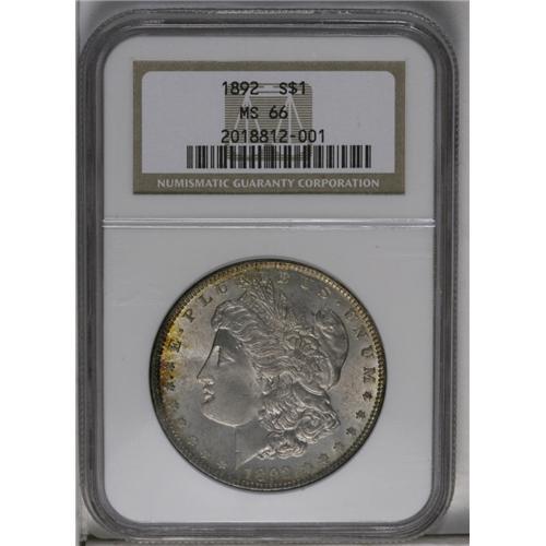 <B>1892<img border='0' src='http://www.heritagecoins.com/images/star.gif' width=10 height=10>$1> MS66 NGC.</B></I> VAM-3. The mintage of the 1892 is relatively low for a Philadelphia issue. Just above 1 million pieces were struck. While this production is more than the 1893 through 1895 rarities, in addition to the well-saved 1899, most Philadelphia issues have mintages in the millions. This includes the conditionally rare 1901. The 1892 is available through the MS62 grade, but Gems are very scarce, and at the MS66 level, NGC has certified only the present piece, with none finer (as of 6/06). The present remarkable Premium Gem fully merits its lofty numerical assessment, since even the cheek lacks relevant contact. The strike is penetrating, luster is comprehensive, and the golden-brown and dove-gray toning is clearly original. The upper reverse legends are strongly die doubled. A prize for the collector who only settle for the best.<BR><I>From The Belle Glade Collection.</B></I>