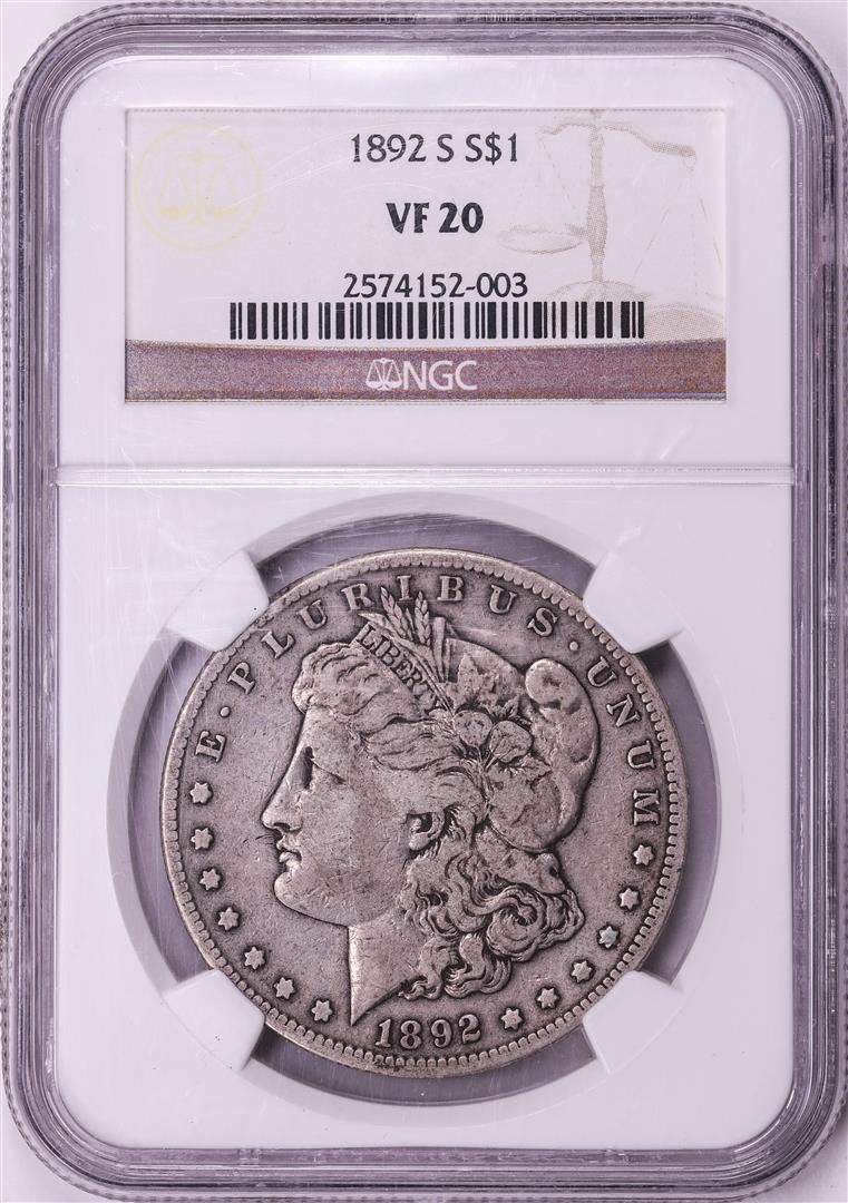 One 1892-S $1 Morgan Silver Dollar Coin NGC VF20. NGC Certified.