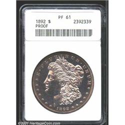 1892 S$1 PR61 ANACS. The frosty devices have mild contrast with the deep lavender fields. Well struck with sharp definition of the breast feathers. Numerous faint slide marks limit the grade but not the eye appeal. Important notice: We expect to be auctioning lots at the rate of 200-250 per hour. Sometimes eBay Premier live bid software cannot keep up with that pace, so we strongly recommend that you place a realistic proxy bid now as insurance to avoid disappointment. Also please note that all Heritage/CAA lots purchased through eBay Premier carry a 20% Buyer's Premium.