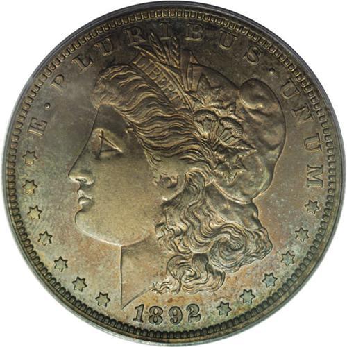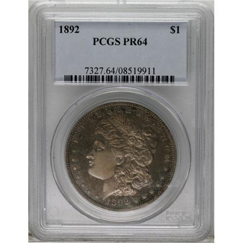 <B>1892 S$1 PR64 PCGS.</B></I> David Bowers (2006) writes that the proof mintage was overly large for this year as there was an exceptional demand for 1892 silver proof sets. He also mentions that "Many proof dollars were probably spent for face value." The PR64 specimen offered in this lot displays dusky gray, lavender, powder-blue, and gold patination. Generally well struck, save for minor softness in the centers. There are no significant contact marks, just a few unobtrusive obverse slide marks that preclude a higher grade. Population: 78 in 64, 71 finer (2/07).<BR><BR><b>Shipping:</b> Coins & Currency (<a target="_blank" href="http://www.heritageauctions.com/common/shipping.php">view shipping information</a>)