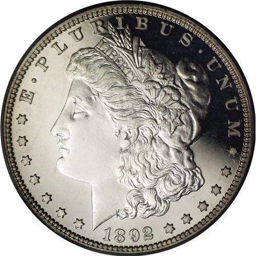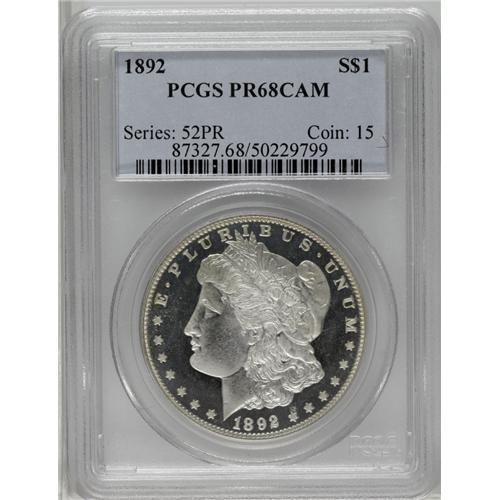 <B>1892<img border='0' src='http://www.heritagecoins.com/images/star.gif' width=10 height=10>$1> PR68 Cameo PCGS.</B></I> The mintage of proof Morgan dollars was markedly higher in 1892 than in the immediate years both prior and after, perhaps partly due to the Columbian Exposition that was originally scheduled for that year. The higher mintage is also explained in part by the introduction of the Barber dime, quarter, and half dollar during this year. Along with the new design change came an increased interest in collection, and this was followed a year later by Heaton's study of mintmarked coinage, also contributing to the rise in popularity of the numismatic hobby. Many of the 1892 proofs suffered from indifferent striking quality overall, with a number of coins lacking complete highpoint definition. Such was not the case with the currently offered Superb Gem, however, which appears to be fully struck.<BR> This is an impeccable cameo proof that displays a glassy, untoned appearance, with none of the often-seen weakness on the hair curls over Liberty's ear. The contrast between fields and devices is unmistakable, and the fragile fields have survived hairline-free and undisturbed by even the slightest evidence of contact. It is essentially untoned on the obverse, but the reverse is beginning to show hints of golden toning on some of the peripheral devices.<BR> Just two examples of this issue have been graded as PR68 Cameo by PCGS, with only a single finer PR68 Deep Cameo example certified by the same service (2/06).