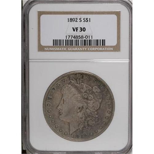 <B>1892-S $1 VF30 NGC.</B></I> . NGC Census: (68/1907). PCGS Population (91/1642). Mintage: 1,200,000. Numismedia Wsl. Price for NGC/PCGS coin in VF30: $201. (#7218)<BR><BR><B>Coin Engraver:</B> George T. Morgan<BR><BR><b>Shipping:</b> Coins & Currency (<a target="_blank" href="http://www.heritageauctions.com/common/shipping.php">view shipping information</a>)