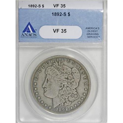 <B>1892-S $1 VF35 ANACS.</B></I> NGC Census: (82/1796). PCGS Population (114/1503). Mintage: 1,200,000. Numismedia Wsl. Price for NGC/PCGS coin in VF35: $247. (#7218)<BR><BR><B>Coin Engraver:</B> George T. Morgan<BR><BR><b>Shipping:</b> Coins & Currency (<a target="_blank" href="http://www.heritageauctions.com/common/shipping.php">view shipping information</a>)
