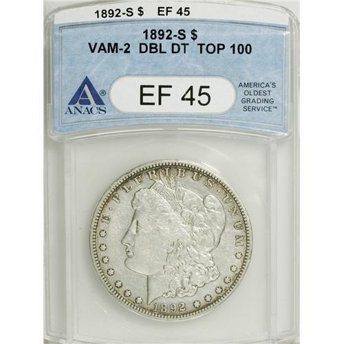 <B>1892-S $1 --Double Date--XF45 ANACS.</B></I> Vam-2, Top-100. NGC Census: (707/776). PCGS Population (551/658). Mintage: 1,200,000. Numismedia Wsl. Price: $630. (#7218)<BR><BR><b>Shipping:</b> Coins & Currency (<a target="_blank" href="http://www.heritageauctions.com/common/shipping.php">view shipping information</a>)