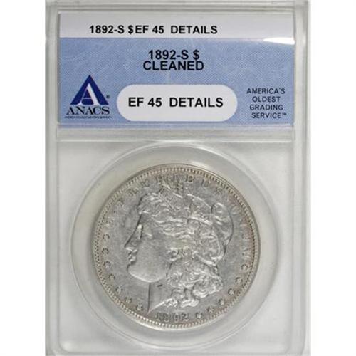 <B>1892-S $1 --Cleaned--ANACS. XF45 Details.</B></I> NGC Census: (732/812). PCGS Population (576/674). Mintage: 1,200,000. Numismedia Wsl. Price for NGC/PCGS coin in XF45: $744. (#7218)<BR><BR><B>Coin Engraver:</B> George T. Morgan<BR><BR><b>Shipping:</b> Coins & Currency (<a target="_blank" href="http://www.heritageauctions.com/common/shipping.php">view shipping information</a>)