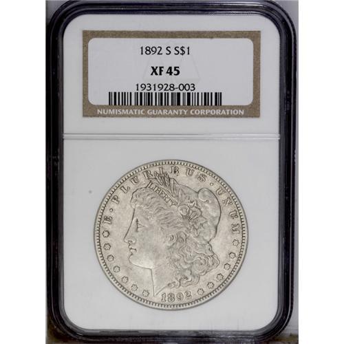 <B>1892-S<$1> XF45 NGC.</B></I> A nice coin for the grade that is modestly circulated. The surfaces are a medium gray color overall. An exceptionally fine example of this scarce issue. <BR><BR><B>Important notice:</B> Heritage usually auctions material at the rate of 200-250 lots per hour. On some occasions eBay Live bid software or the Internet may not be able to keep up with the pace of the auction. We recommend placing a realistic absentee bid now as insurance to avoid disappointment. Occasionally the auctioneer may eliminate or reject an eBay Live bid, and the auctioneer may also reopen a lot after the close of the eBay live bidding (usually because we missed an audience bid), and may reject your bid even if it shows you as the winning bidder. By bidding via eBay Live, you agree that Heritage may award the lot to another bidder at its sole discretion under the circumstances described above or any other reasonable circumstances. Since eBay bids are not shown to us until we open the lot on the floor, we treat those bids just like floor bids. In most cases the floor responds before the eBay bid is presented to us, due to Internet lag time, so for consistency we have made it a policy that floor bids are always considered first over tie eBay live bids. Also please note that all Heritage lots purchased through eBay Live carry a 20% Buyer's Premium. Please make sure you read the Terms and Conditions before you bid. This lot is being auctioned in conjunction with a live floor auction by Heritage Galleries & Auctioneers. All final auction and invoice information will be supplied by Heritage Galleries & Auctioneers, and all other information should be considered preliminary. Lot:3605 <BR><BR><B>Winning Notification and Billing:</B> After the FINAL session in this auction is complete, Heritage will send e-mail and snail mail invoices. This process normally takes several days. All final auction and invoice information will be supplied by Heritage Galleries & Auctioneers, and all other information should be considered preliminary. <BR><BR>This auction will be conducted on a live auction floor and over the Internet through eBay Live. If you choose to place an absentee bid, please take a moment to <font color='#0000ff'><u><a href='http://pages.ebay.com/liveauctions/help/before/laabsentee.html'>learn how eBay Live absentee bidding works</a></u></font><font color='#000000'>