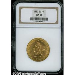 <B>1892-S $10 MS62 NGC.</B></I> An impressive example that does not have many moderate marks. A decidedly better date, particularly when found with the eye appeal and full luster of the present piece.