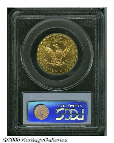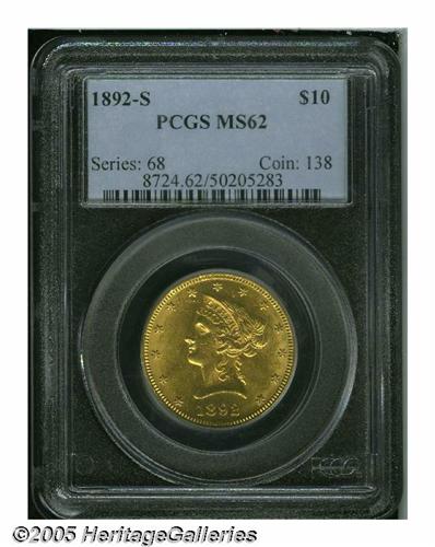 <B>1892-S<$10> MS62 PCGS.</B></I> A boldly struck and lustrous example that has bright yellow-green patina, with dark-rose accents in the reverse fields. Both sides are mildly, typically abraded, for the grade. A nice example of this conditionally scarce issue, which becomes extremely difficult any finer, and is virtually unobtainable above MS63. Population: 46 in 62, 26 finer (5/05).